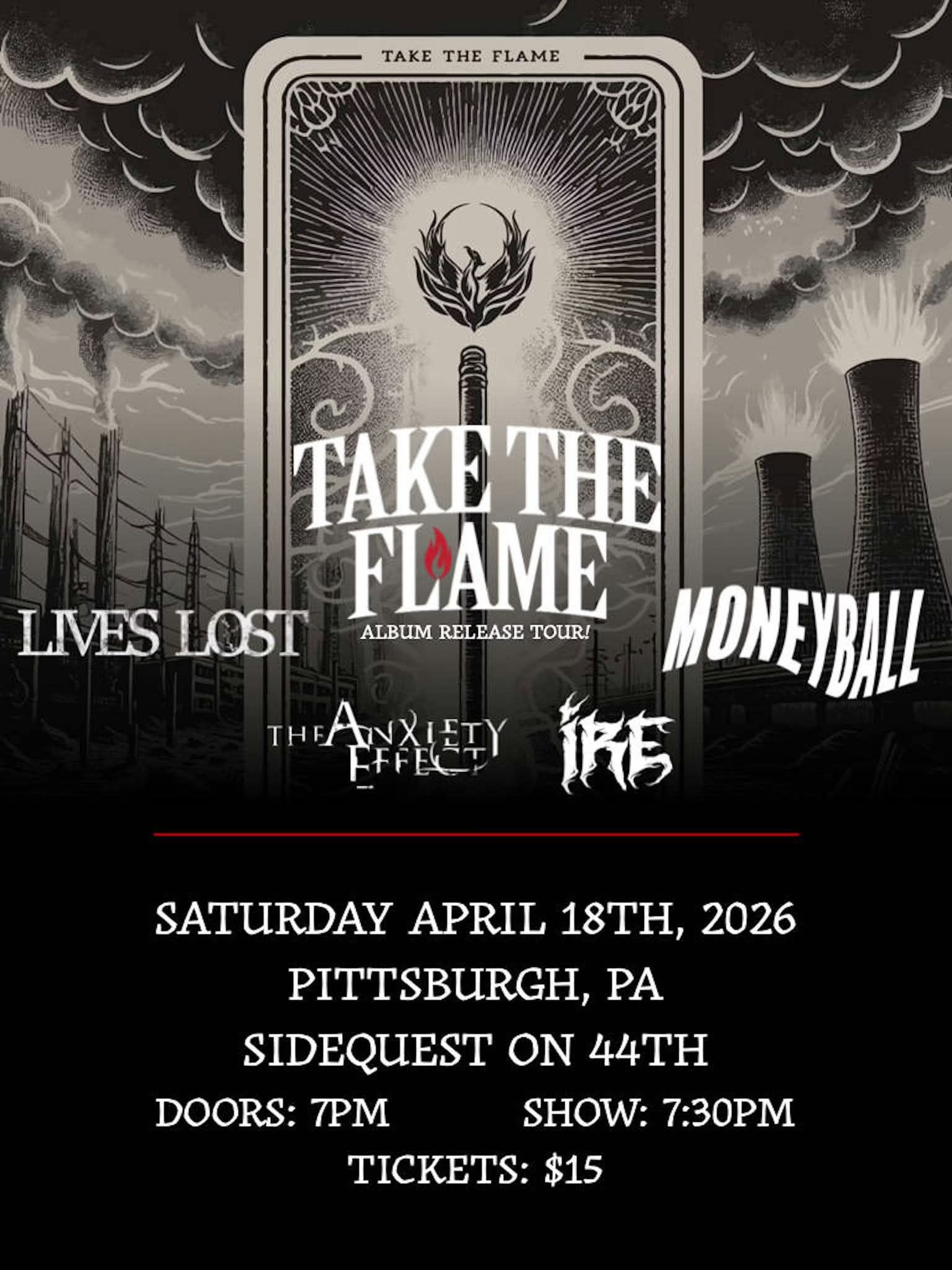 Take The Flame is bringing the album release tour to Sidequest on 44th in Pittsburgh, Pa! Opening acts include appearance from The Anxiety Effect as well as Lives Lost, IRE, and Moneyball! Doors at 7pm, bands lock off at 7:30pm! Ages 21+ only.